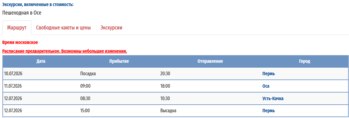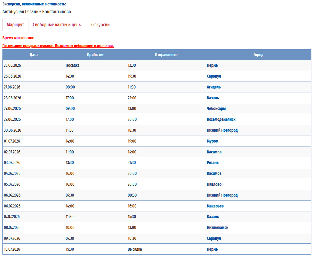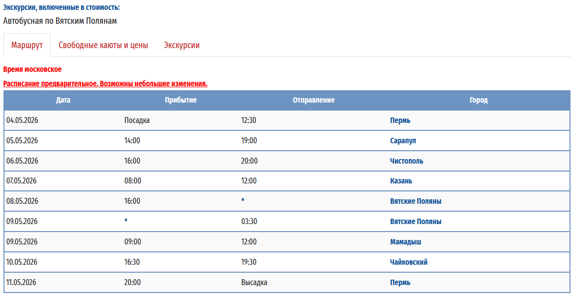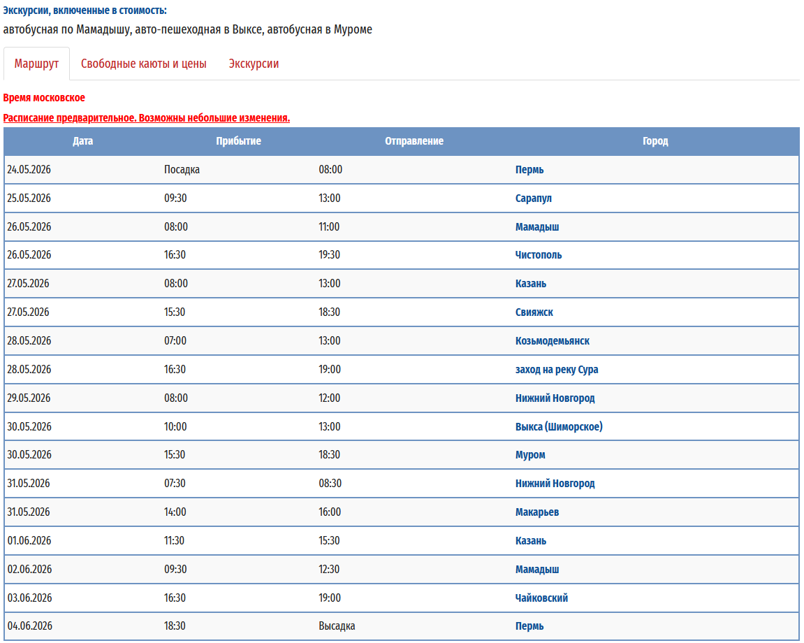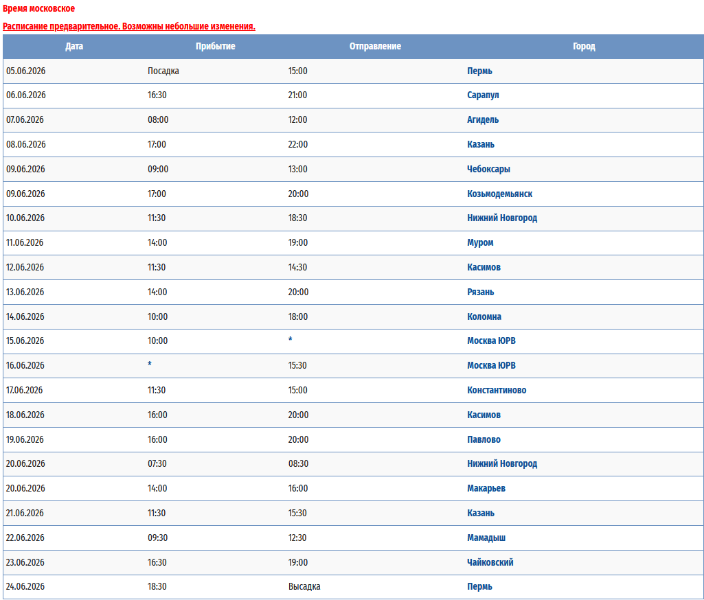 - − Пермь - Мамадыш (р.Вятка) - заход на р.Сура - Нижний Новгород - Выкса (р.Ока) - Муром (р.Ока) – Пермь с 24 мая 2026 по 04 июня 2026 — 12 дней *