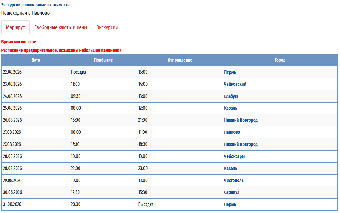 - − Пермь – Нижний Новгород - Павлово (р.Ока) – Пермь с 22 августа 2026 по 31 августа 2026 — 10 дней *