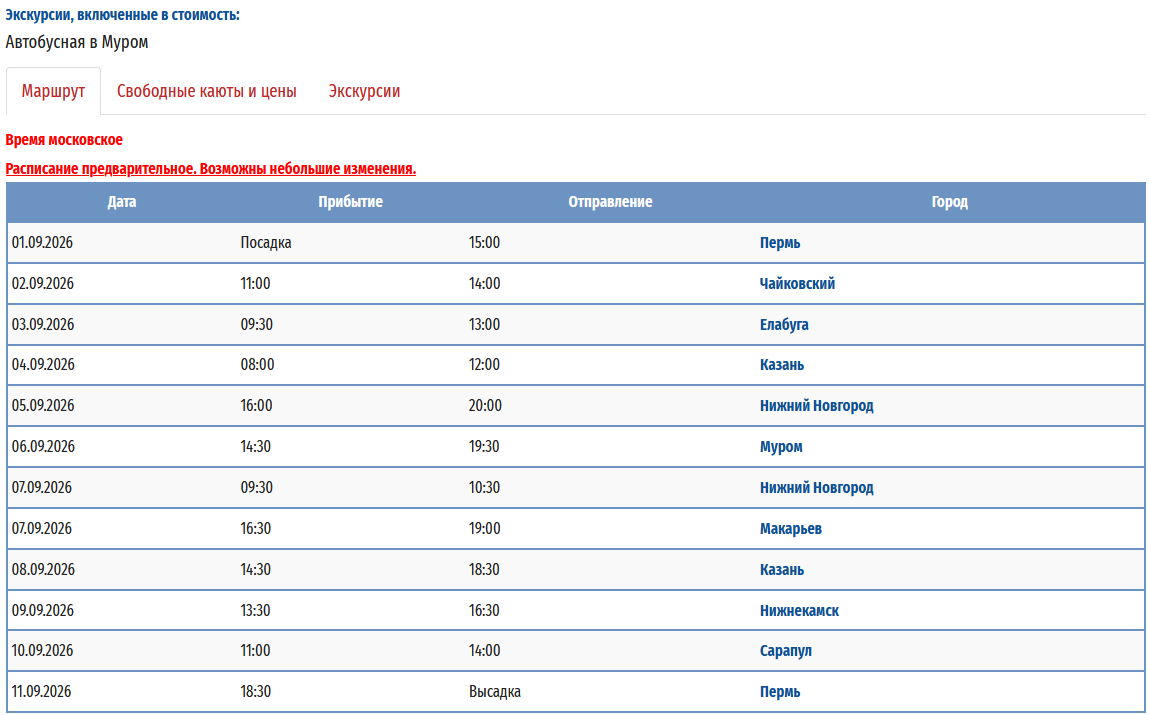 - − Пермь – Нижний Новгород - Муром (р.Ока) – Пермь с 01 сентября 2026 по 11 сентября 2026 — 11 дней
