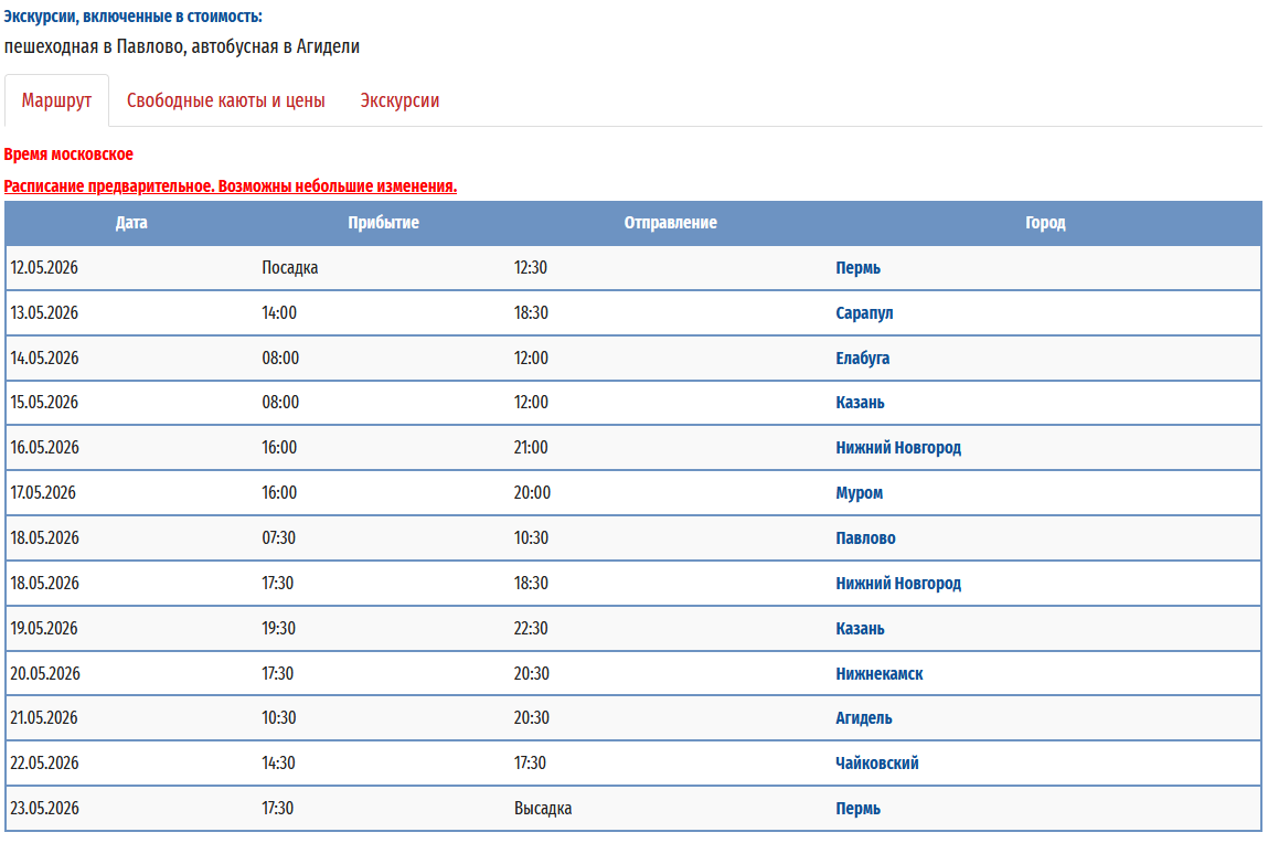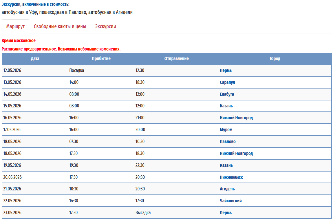 - − Пермь – Нижний Новгород - Муром (р.Ока) - Павлово (р.Ока) - Агидель (р.Белая) + Уфа – Пермь с 12 мая 2026 по 23 мая 2026 — 12 дней *