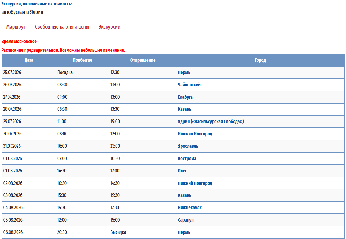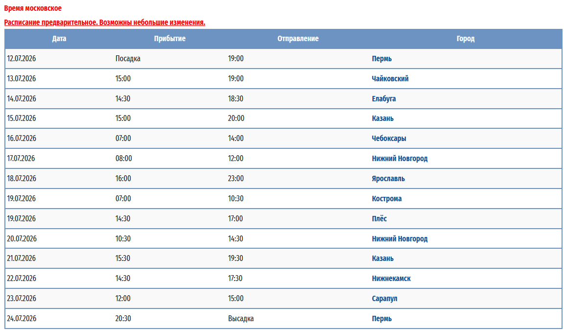 Расписание круизов на теплоходе "Борис Полевой" в навигацию 2026 года