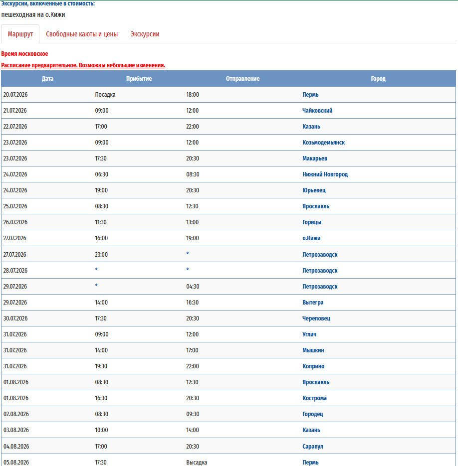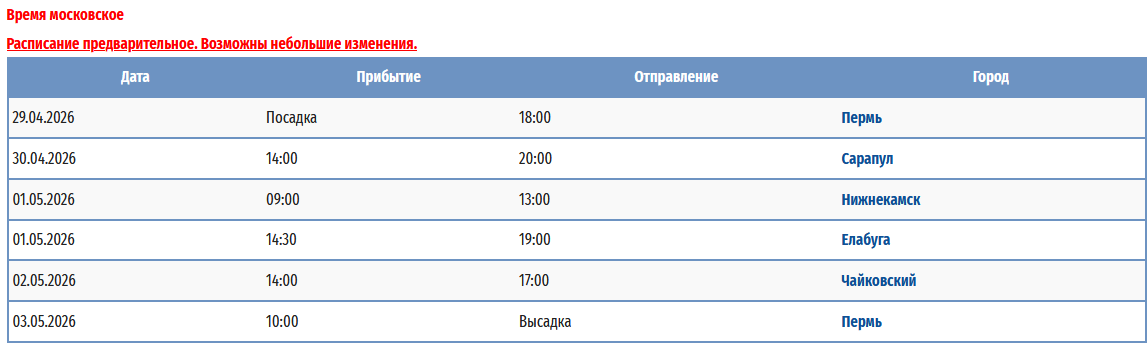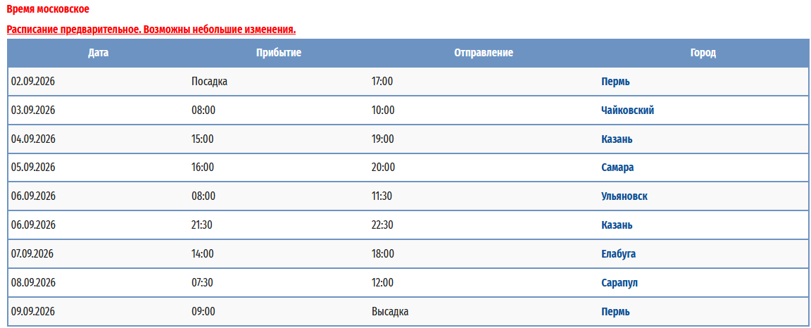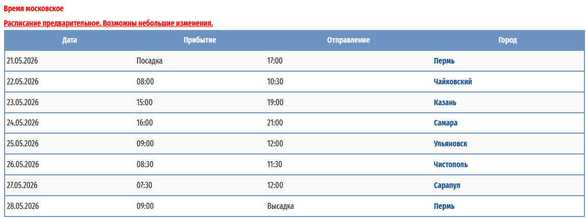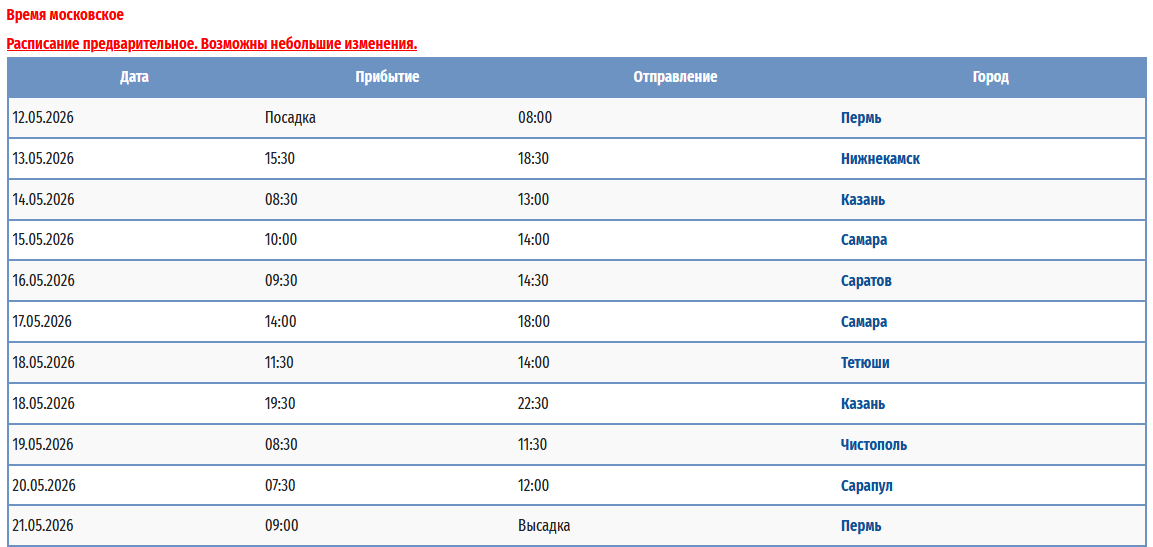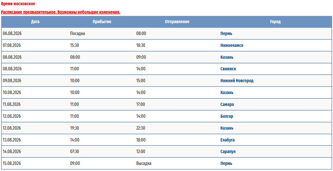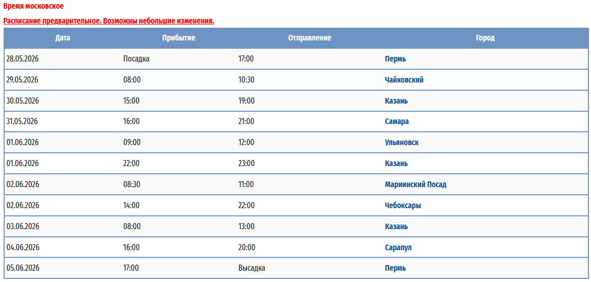 Расписание круизов на теплоходе "Михаил Кутузов" в навигацию 2026 года