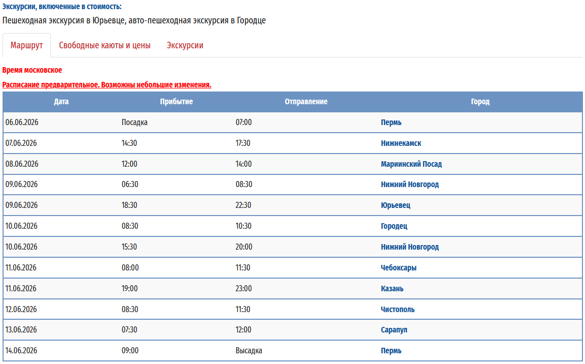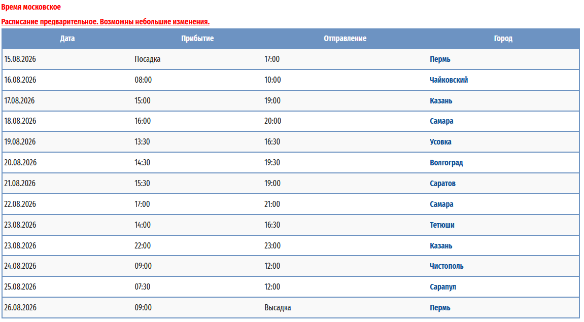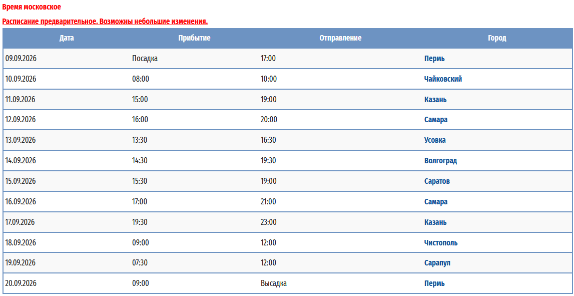 - − Пермь – Волгоград – Пермь с 15 августа 2026 по 26 августа 2026 — 12 дней
