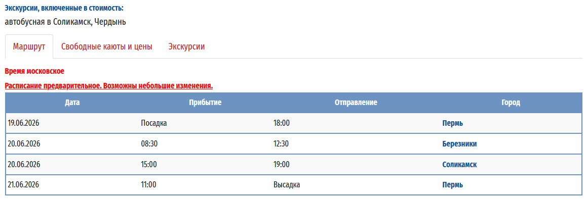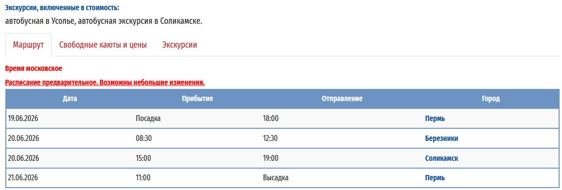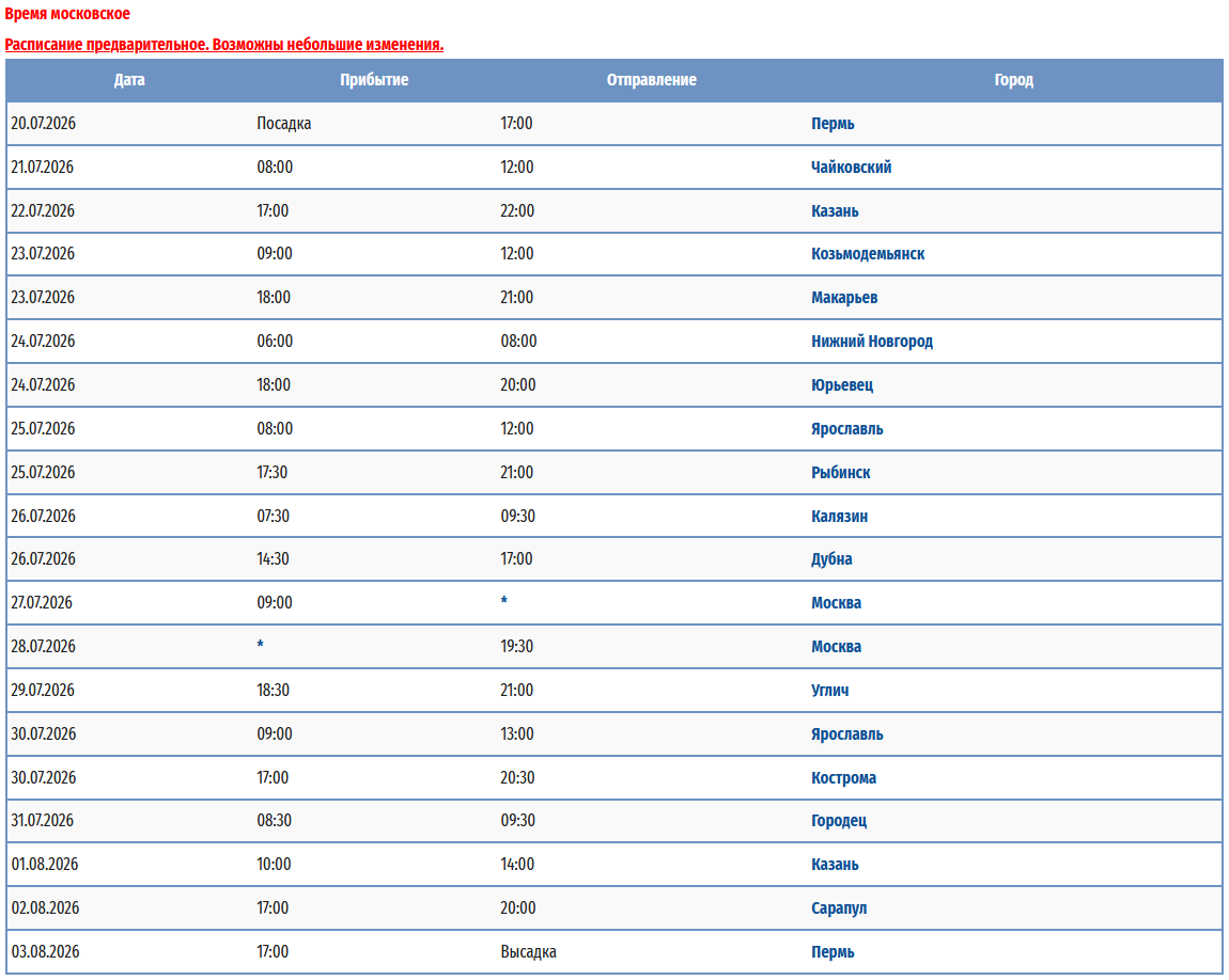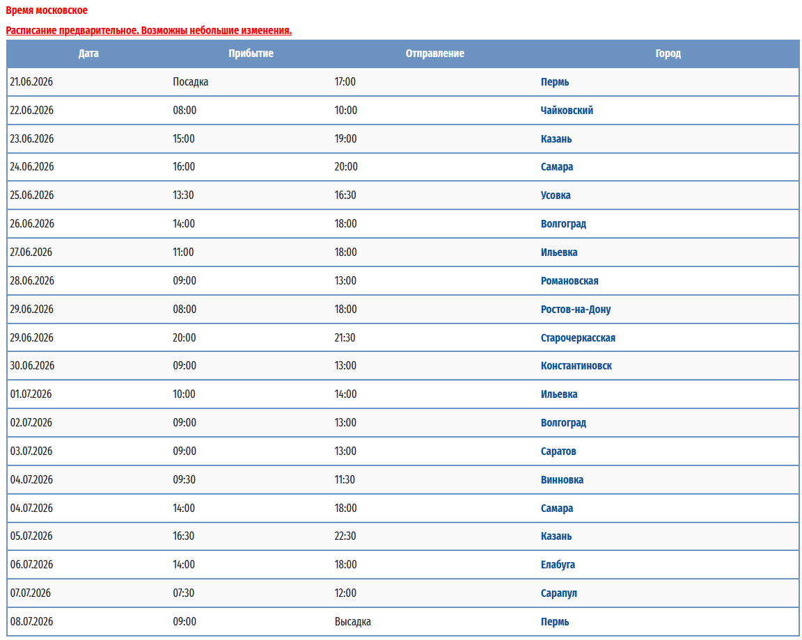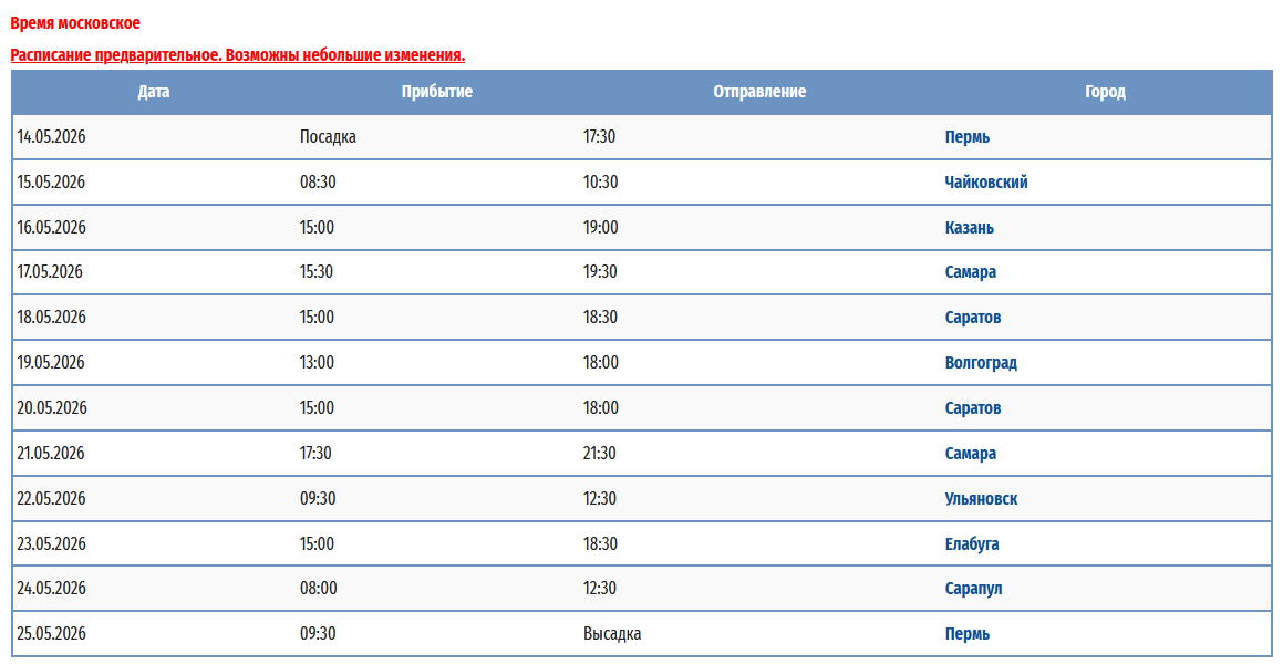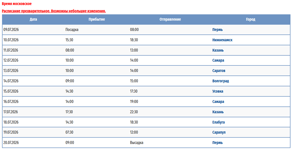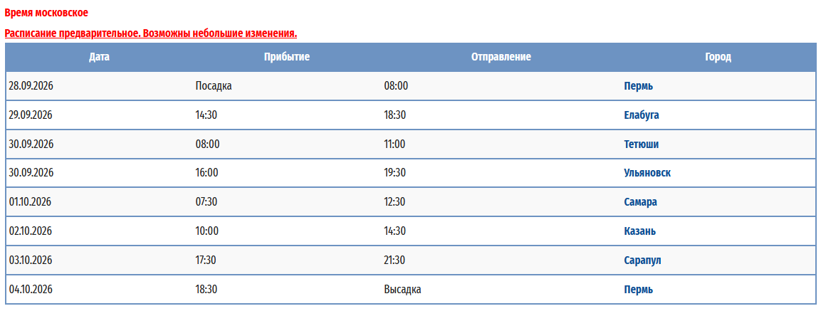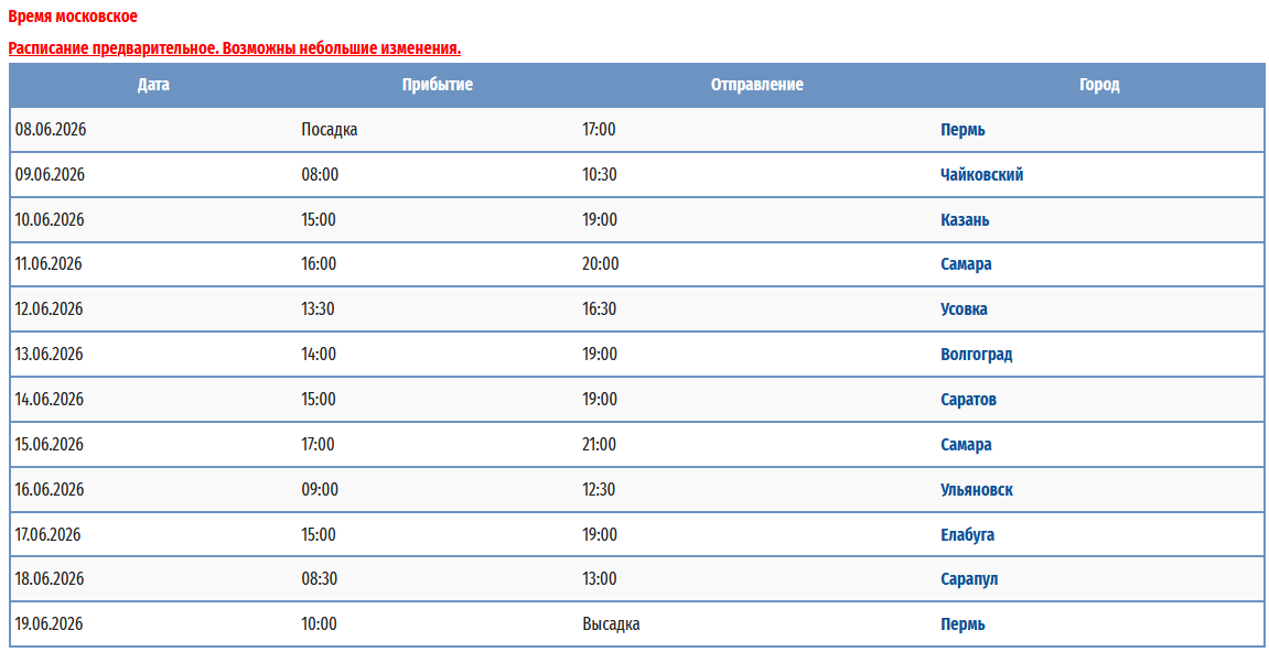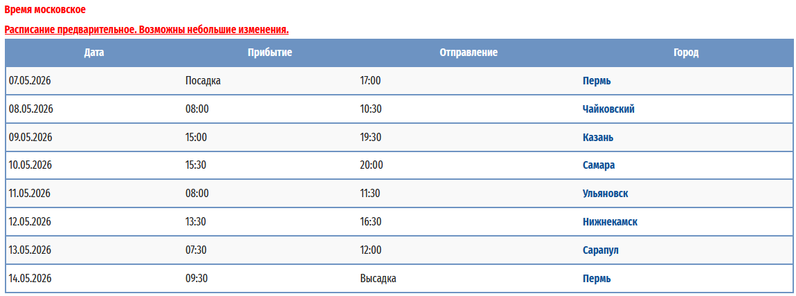Расписание круизов на теплоходе "Павел Бажов" в навигацию 2026 года