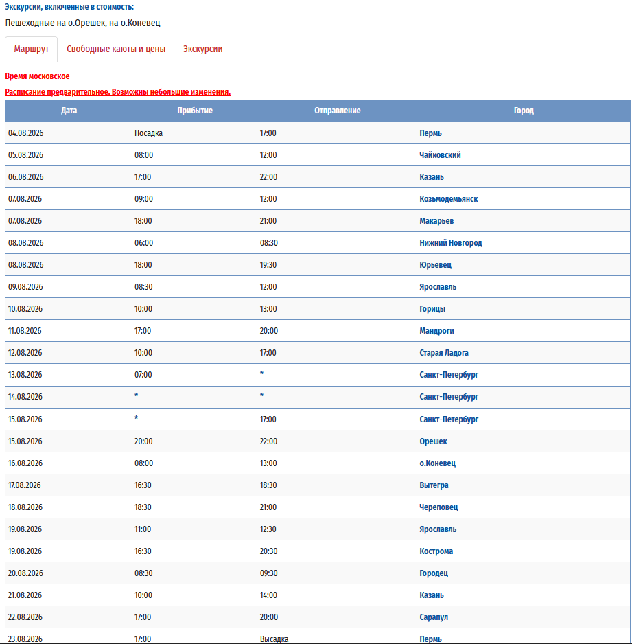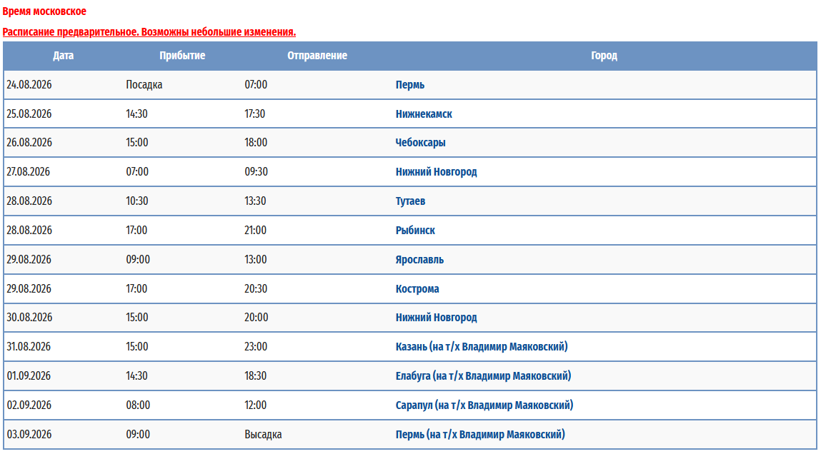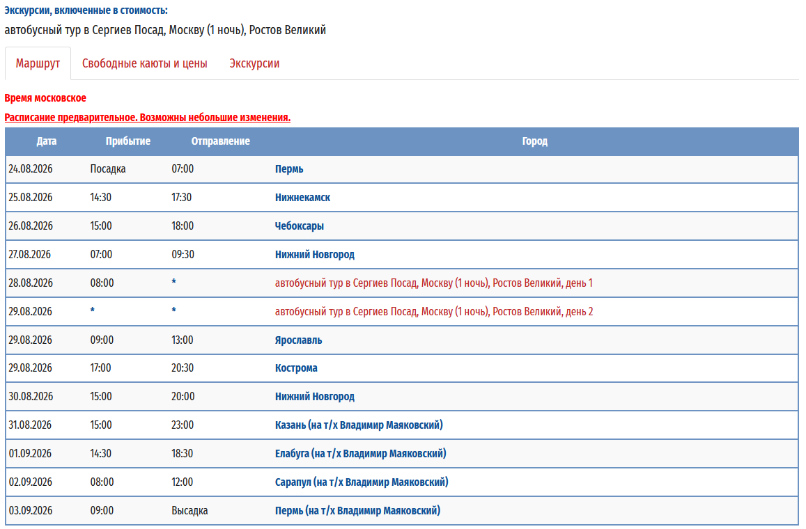 - − Пермь – Ярославль + Сергиев Посад, Москва (1 ночь), Ростов Великий - Казань (пересадка на т/х "Владимир Маяковский") – Пермь с 24 августа 2026 по 03 сентября 2026 — 11 дней *