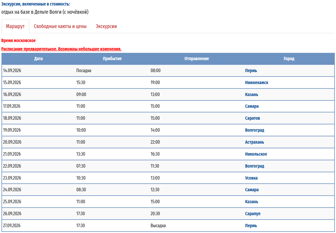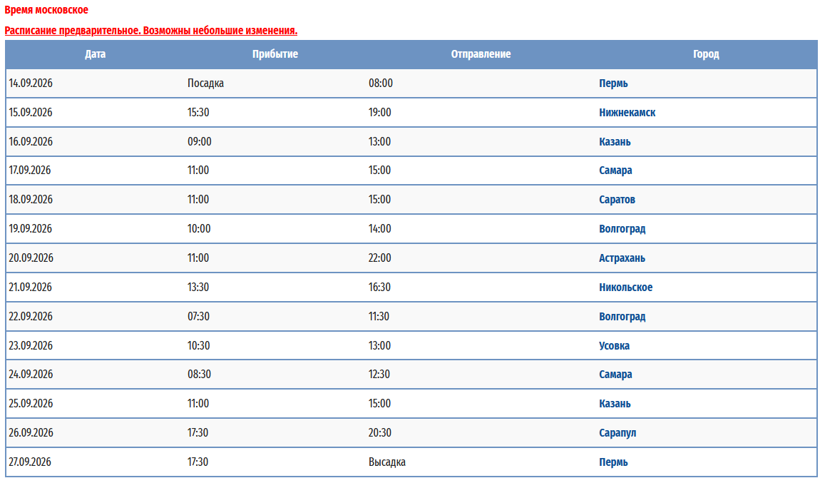 - − Пермь – Астрахань – Пермь с 14 сентября 2026 по 27 сентября 2026 — 14 дней