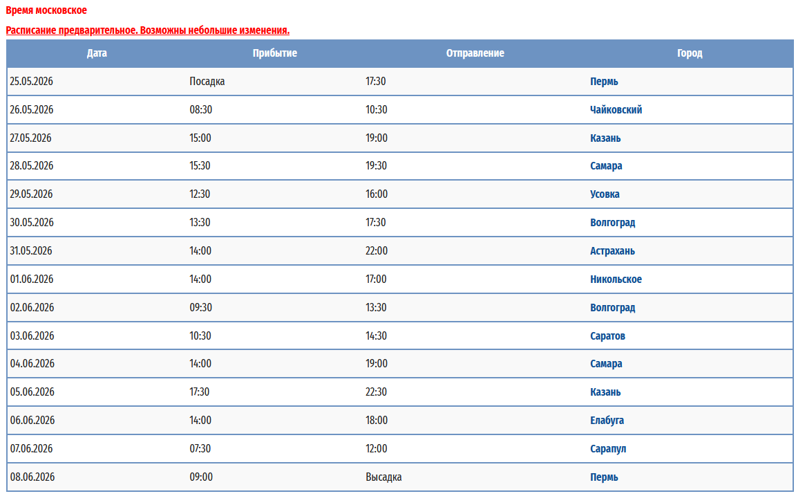 - − Пермь – Астрахань – Пермь с 25 мая 2026 по 08 июня 2026 — 15 дней