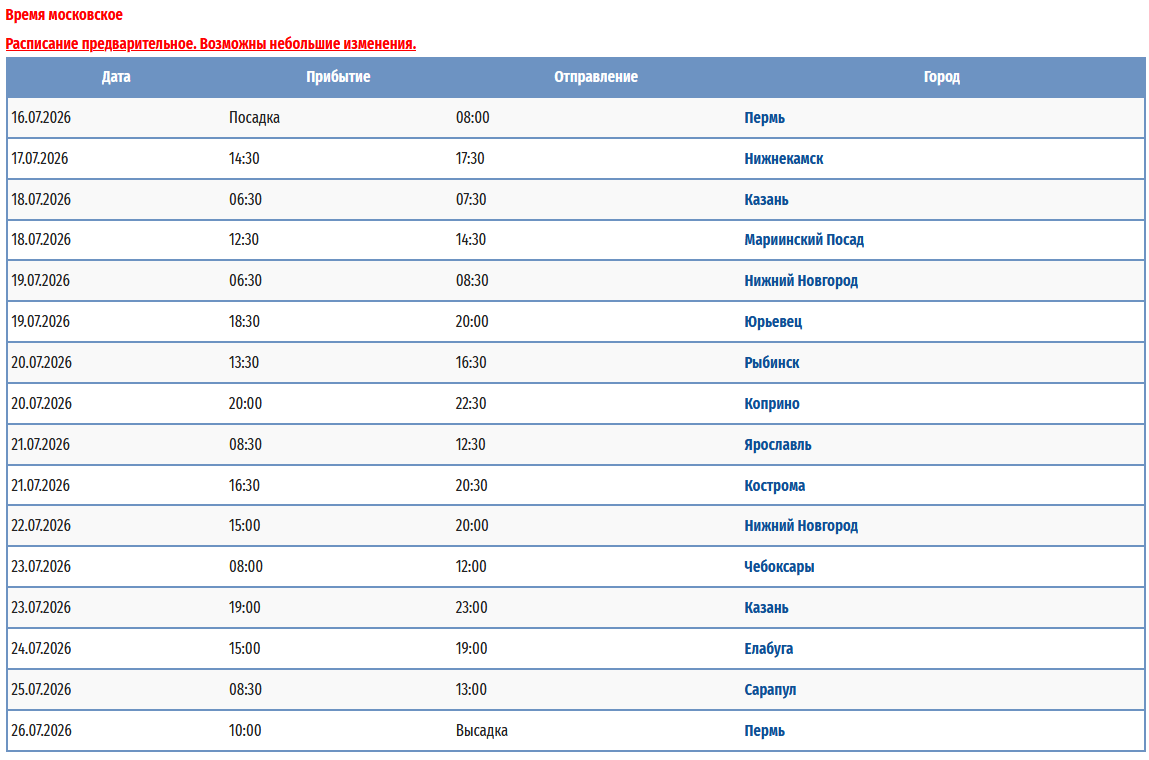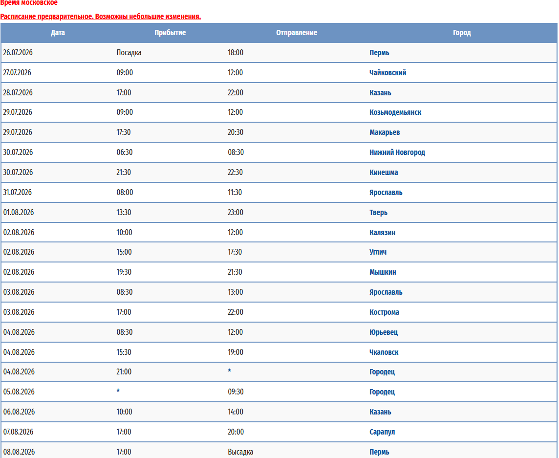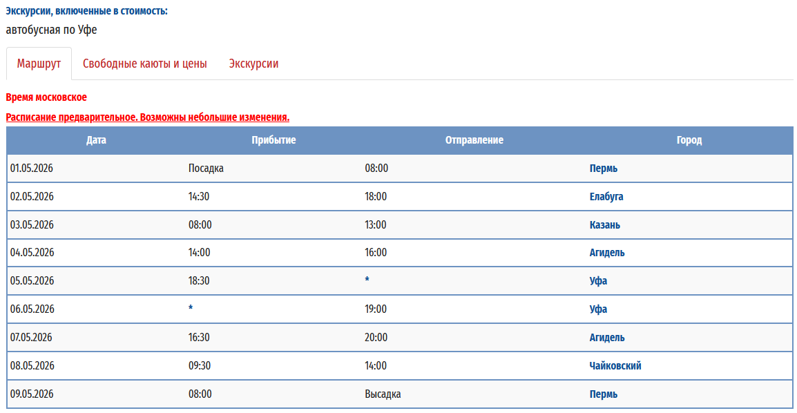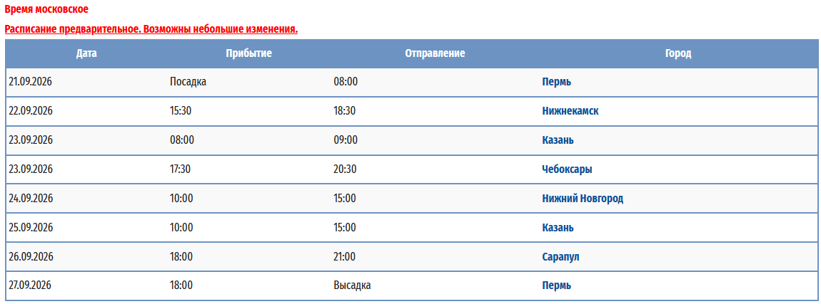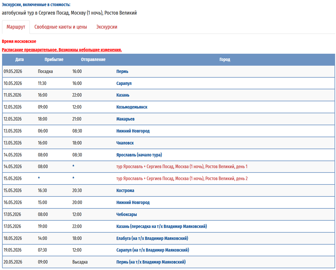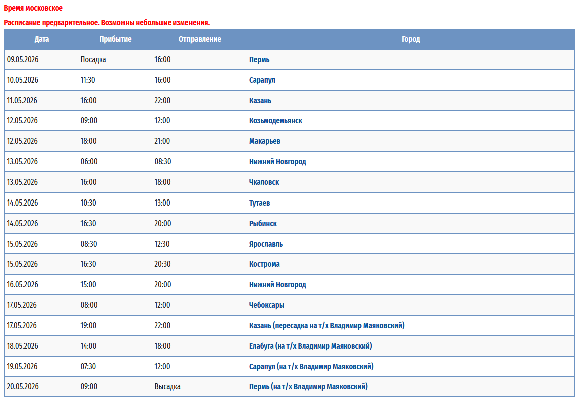 - − Пермь – Ярославль - Тутаев - Рыбинск - Казань (пересадка на т/х "Владимир Маяковский") - Пермь с 09 мая 2026 по 20 мая 2026 — 12 дней