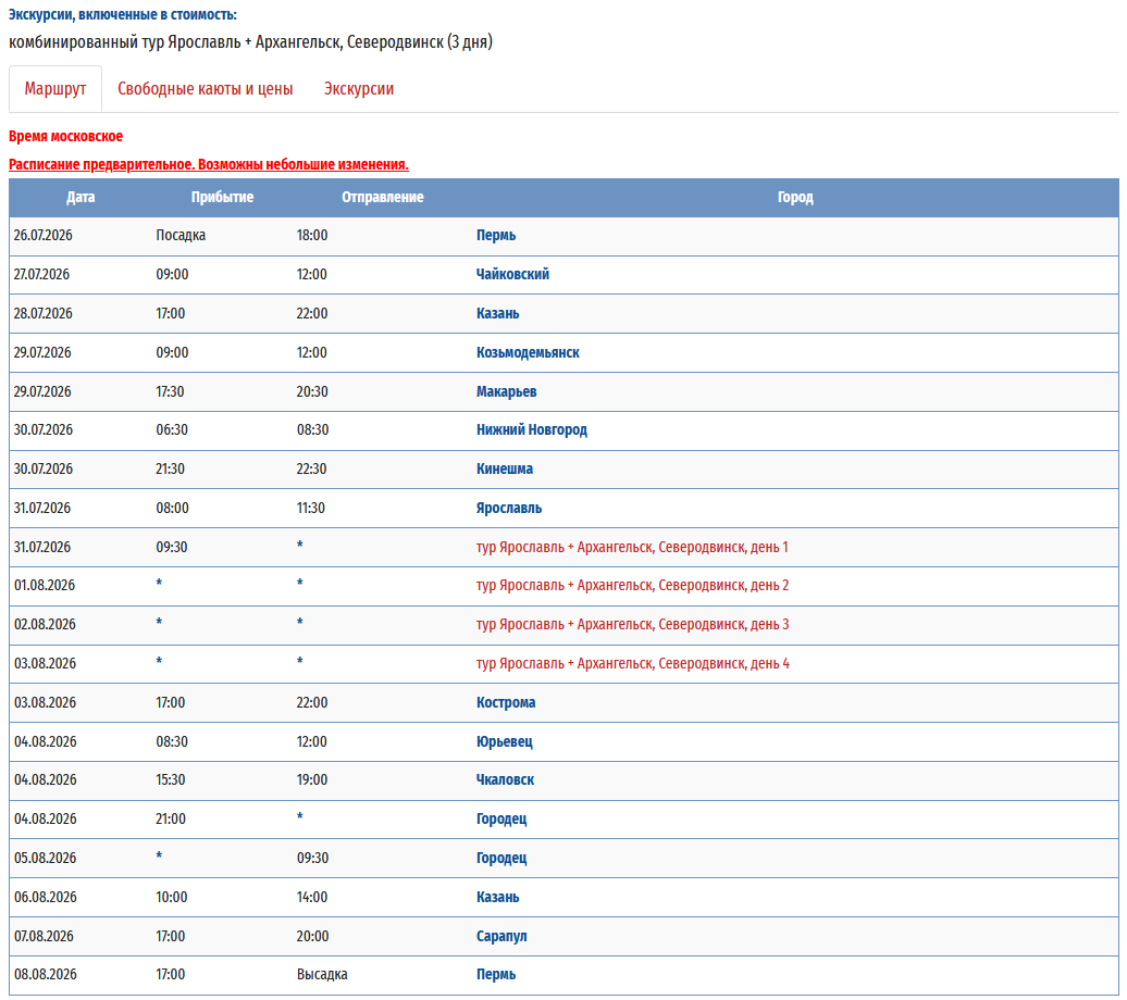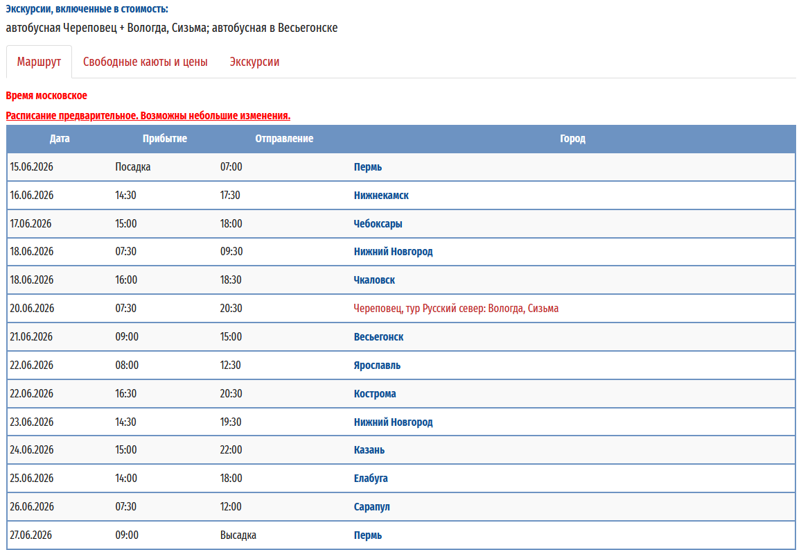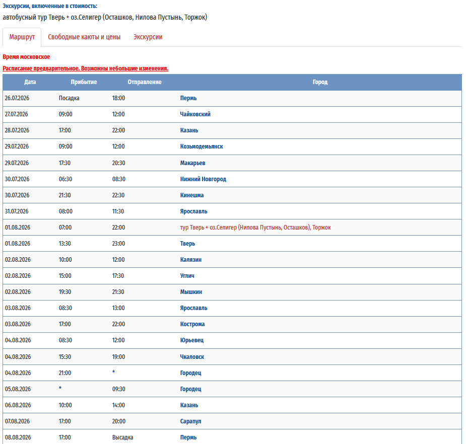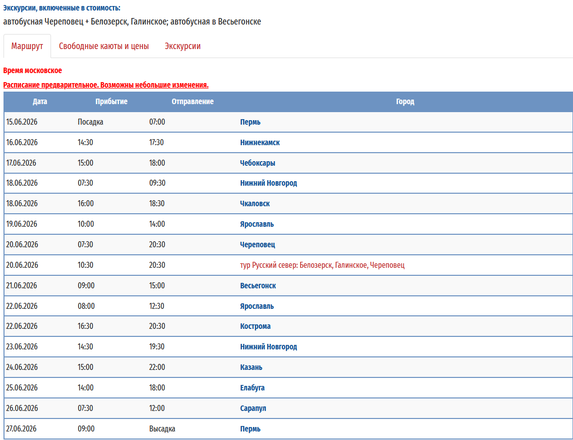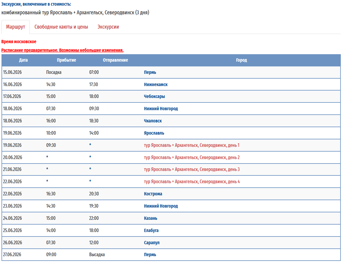 - − Пермь – Ярославль - Тутаев - Рыбинск - Казань (пересадка на т/х "Владимир Маяковский") - Пермь с 09 мая 2026 по 20 мая 2026 — 12 дней