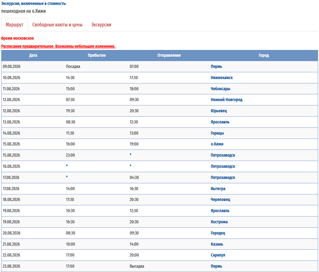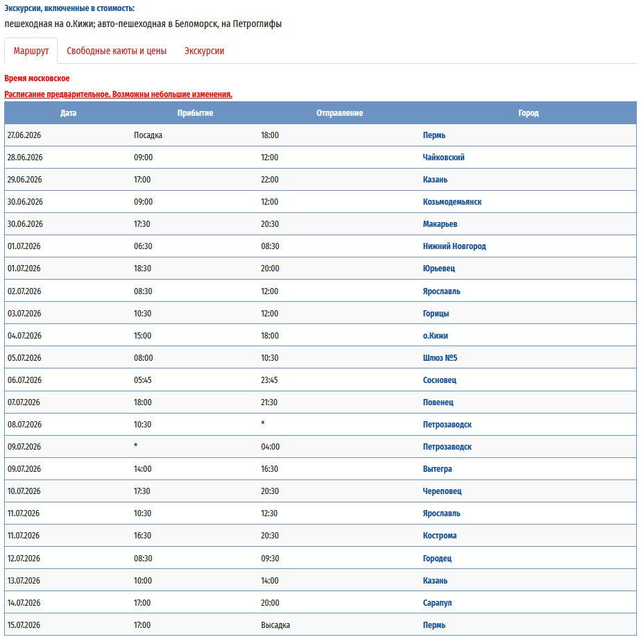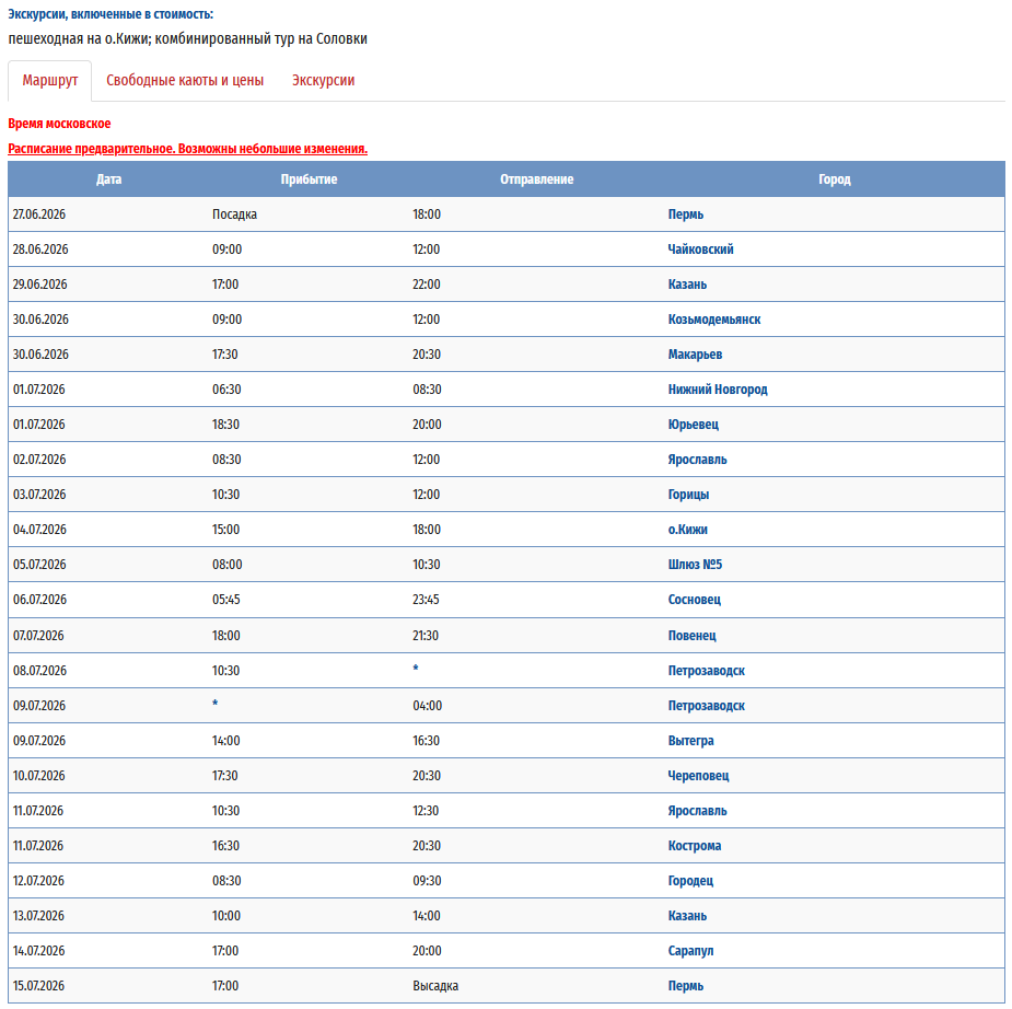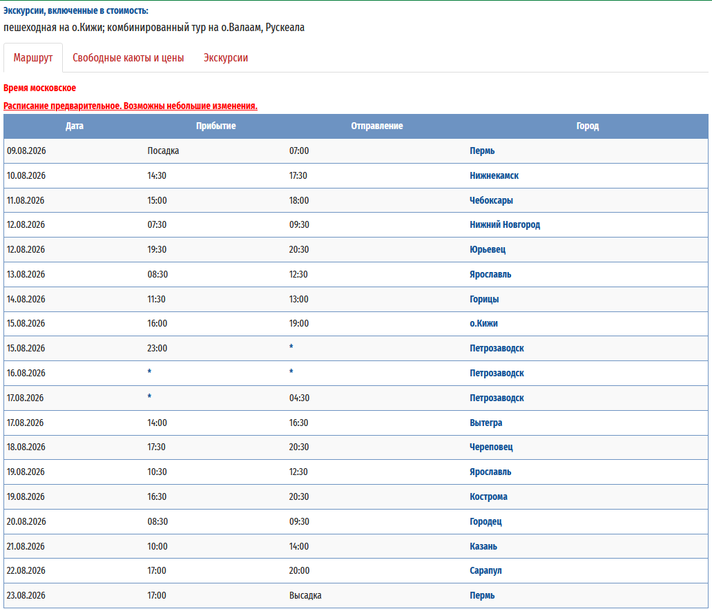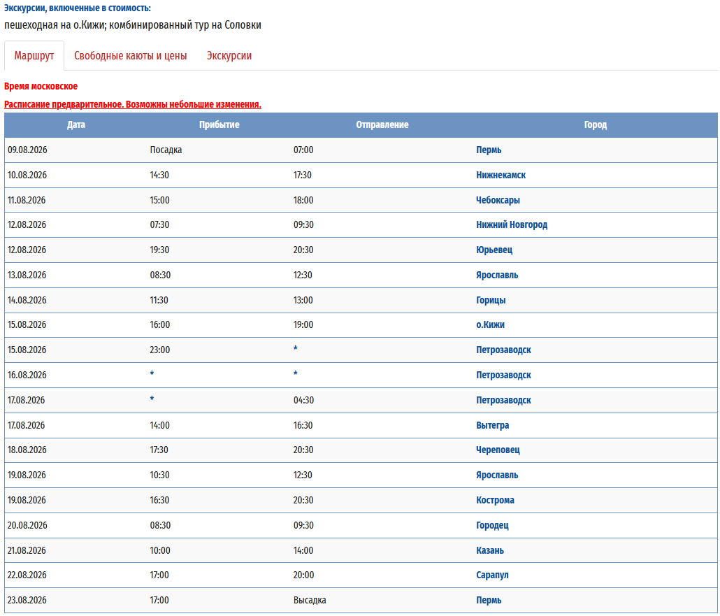 - − Пермь – Вытегра + «Онежское кольцо» (с ночёвкой на базе отдыха) – Петрозаводск – Пермь с 09 августа 2026 по 23 августа 2026 — 15 дней *